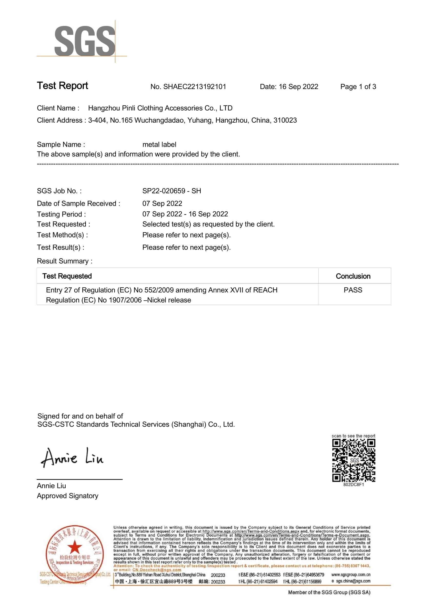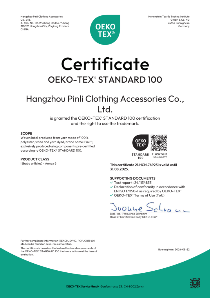 Certification 1. STANDARD 100 by OEKO-TEX® – woven labels 2. SGS certification – metal labels’ nickel free 3. SGS certification – shoelace head